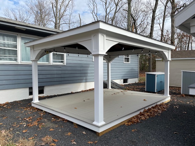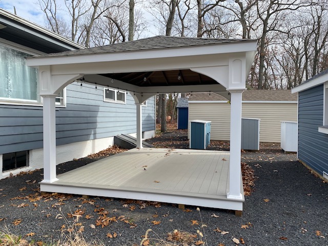 12' x 16' Vinyl Hip Roof Pavilion Siding Vinyl Color White Roof Weatherwood Features (4) 6" x 6" x 8' Posts with Vinyl Sleeves 6/12 Pitched Roof Harbor Gray PVC Decking with 4" x 4" Runners Walnut Semi-Transparent Ceiling Stain Price $14,615
