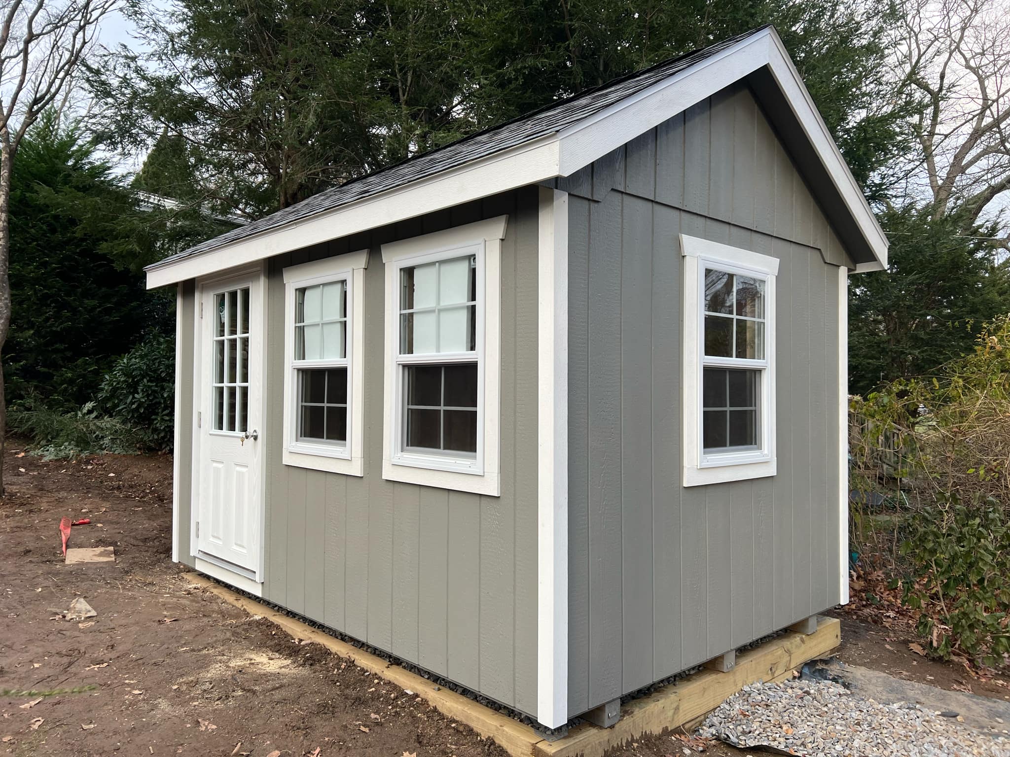 tall wall studs, PVC fascia, 3 ½ in PVC corners, 6 in overhangs on 4 sides, a set of double doors, 2 – 24 in x